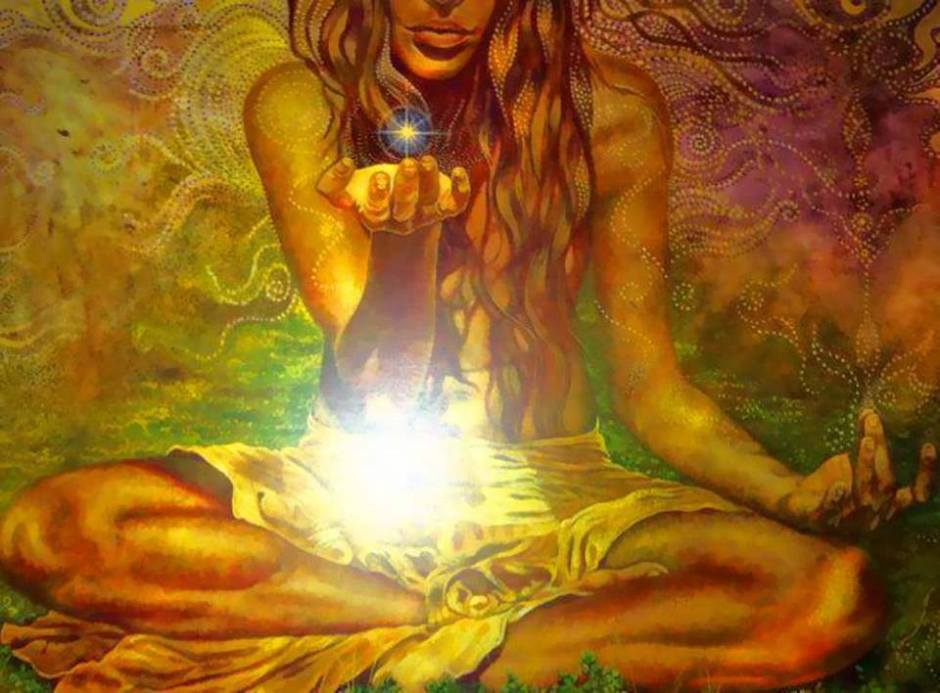 Bal kézzel formálj kelyhet a szíved alatt, amíg a jobb kezedet erőteljesen kinyújtod egyenesen a fejed fölé, majd engedd le jobb kezedet a bal kézhez, hogy a szívnél egyesülve csatlakozzanak az isteni akarathoz.”